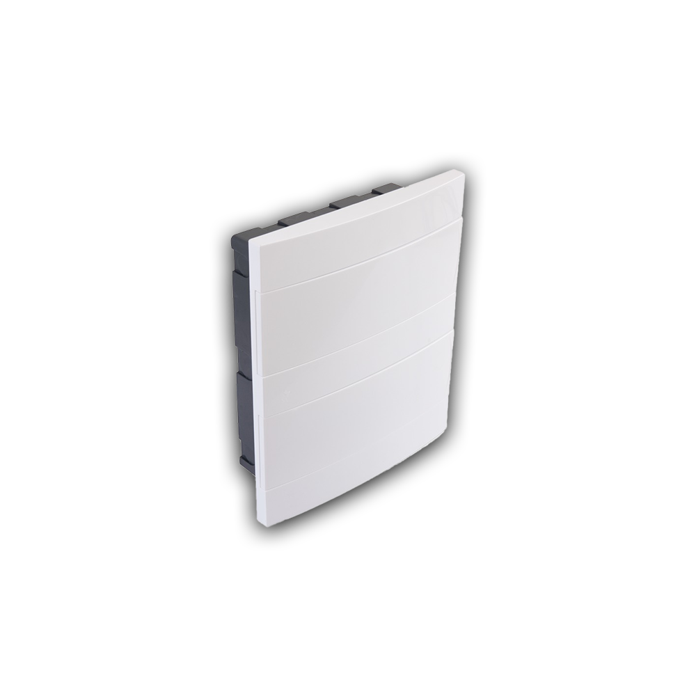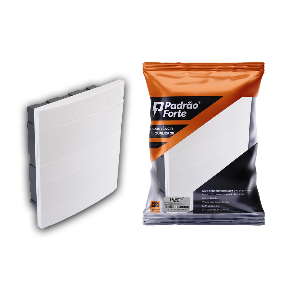 Centro de distribuição de embutir para 24 disjuntores monopolares com 375mm de comprimento, 320mm de largura e 101mm de altura, ideal para instalações residenciais, comerciais e industriais. Fabricado em material resistente com proteção UV e acabamento branco, oferecendo praticidade, durabilidade e proteção dos componentes elétricos.